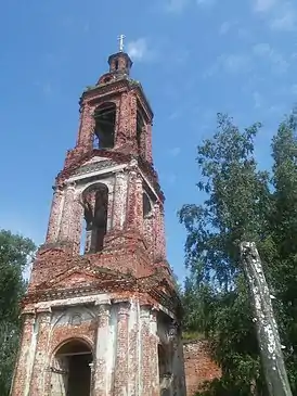 Приделы: в основном храме холодный Предтеченский, в трапезной тёплый Никольский. Представляла собой пятиглавый двухсветный четверик с более широкой трапезной (не сохранился) и трёхъярусной колокольней.