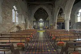 Каменная кладка XIV века была выполнена из облицовочного камня (см. Белый камень), в то время как камни XIII века являются примерно квадратными по форме; разница заметна на северной стене и в остатках первоначальной южной стены. В северной стене — в самом западном из двух цветных окон — содержится витраж XV века. Над северным трансептом XIII века находится комната священника, к которой ведет винтовая лестница от алтарной части; комната включает в себя целый ряд средневековых элементов, таких как камин и «гардероб» (туалет). Экран из дубового прута между нефом и алтарем (см. Лекторий) относится к XV веку и имеет характерный узор «перпендикулярного стиля»; в ограждении присутствуют деревянные двери XVII века. Алтарь и рака имеют 55 футов (17 м) в длину.