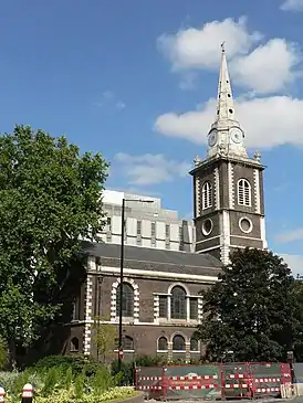 В начале XVIII века оно было описано как «старая церковь, построенная из кирпича, щебня и камня, перестроенная и… готическая»[2]. Здание того времени было 78 футов (24 м) в длину и 53 фута (16 м) в ширину; башня-колокольня, на которой размещались шесть колоколов, имела высоту около 100 футов (30 м). Данное здание было полностью перестроено в период между 1741 и 1744 годами по проекту архитектора Джорджа Дэнса-старшего. Ряд элементов убранства из старого здания был сохранён и переустановлен в новой церкви. Интерьер был обновлён архитектором Джоном Фрэнсисом Бентли в конце XIX века.