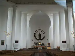 Храм покрыт крышей, опирающейся на стальную конструкцию с колоннами и стеклянным фасадом. Первоначально над главным алтарём располагалась икона святого Альберта. C 2006 года на месте иконы располагается статуя святого Альберта.