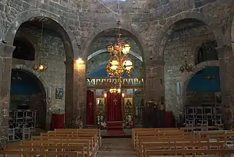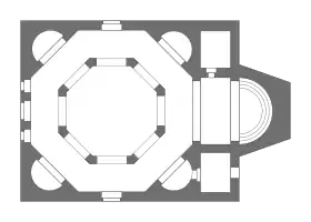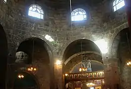 Внутренняя часть здания является октогоном с экседрами в гранях, соответствующих углам здания. Восточная грань переходит в виму и полукруглую внутри апсиду. В центре октогона стоят восемь столбов с арочными перекрытиями, поддерживающих барабан. Стена и столбы создают деамбулаторий, крытый базальтовыми плитами. Последний ряд кладки барабана состоит из плит, создающих у 8-гранника 16-гранное завершение, на которую установлен купол. Де Вогюэ в своей книге сообщает и приводит иллюстрацию того, что был ещё один ряд, создающий 32-гранник, но сейчас этого не наблюдается. План церкви близко напоминает планы несохранившихся церквей рубежа IV—V веков в Филиппах и на горе Гризим[7].