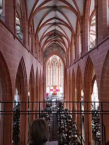 Уровень северной эмпоры находится ниже южной[20]. Необычным является то, что боковые нефы шире центрального, благодаря чему библиотека курфюрста Людвига III была помещена именно туда. Другой особенностью является то, что главная зрительная ось направлена не как обычно, через одной из окон в хоры, а через один из контрфорсов. Такой смелый мотив смещения осей часто встречается в церковных строениях парлеровской школы[17].