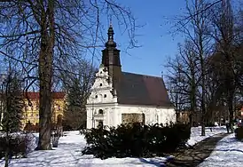 Церковь была построена в 1572 году на новом городском кладбище, основанном в 1559 году в стиле Ренессанса. Во время шведского вторжения храм был повреждён, однако уже в 1661 году его восстановили в стиле маньеризма. В 1720 году были построены колонна и новая спиралеобразная башня.