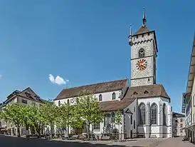 Здание церкви в целом является пятинефной базиликой, основная часть которой имеет форму выпуклого четырёхугольника, в котором все стороны имеют разную длину и ни один угол не является прямым[7]. По своей максимальной ширине — 34 метра — она находится на третьем месте во всей Швейцарии[1], но своим внешним обликом — как это однажды заметил известный швейцарской историк культуры Иоганн Рудольф Ран (нем. Johann Rudolf Rahn) — напоминает скорее громадную деревенскую церковь. На выбеленных стенах отсутствуют какие-либо декорации, за исключением изображений Девы Марии и апостола Иоанна, открытых при реставрации в нише возле ризницы и относящихся к началу XVI века[8], а также солнечных часов.