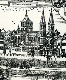 Церковь Святого Куниберта — это романская трёхнефная базилика с трансептом. Церковь имеет одну западную и две восточные башни.