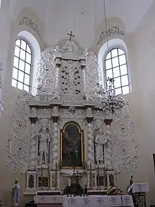 Особым богатым декором отличается двухъярусный главный алтарь с витыми колоннами. В его нижнем ярусе находится ценная икона XVIII века небесного патрона храма, по бокам которого находятся крупномасштабные скульптуры святых. Центр композиции второго яруса занимает скульптурное распятие с коленопреклоненными перед ним фигурами епископов. Вся композиция главного алтаря завершена рельефом «Троица новозаветная» и оформлена стукковым растительным орнаментом, что придаёт ей изысканный кружевной вид. Большую художественную ценность имеет резной позолоченной амвон с навершием в виде короны. Кафедра отделана растительно-цветочными мотивами и опирается на скульптурный образ орла, держащего в когтях геральдический картуш семьи Бжостовских. В крипте храма находились захоронения этого магнатского рода[6].