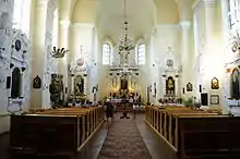 Храм отличается изяществом декорация интерьера, богато украшен бело-голубыми барельефами из стукко. Убранство храма напоминает убранство известного храма Петра и Павла в Вильнюсе, поскольку архитектор Пенс работал над интерьером церкви совместно с итальянским художником Пьетро Перти — одним из авторов скульптурных композиций вильнюсского памятника[5]. Барельефы выполнены в 1684—1700 годов группой иностранных декораторов под руководством Пьетро Перти с участием местного мастера Николая Жилевича, имя которого обнаружено в виленских архивах[6].