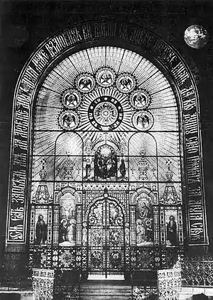 В верхней части купола находился большой круглый витраж с образом Спасителя. Он сохранялся ещё к 1993 году, но в 1995 году был разбит.