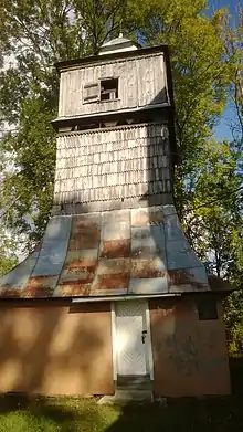К северо-востоку от церкви построена высокая трёхъярусная квадратная каркасная колокольня. Её поддашье плавно переходит в вертикальный объём второго яруса, декорированного в верхней части узким арочным пояском. В третьем ярусе прорезаны прямоугольные отверстия, закрываемые ставнями. Колокольня покрыта четырёхскатной шатровой крышей с заломом. Нижний ярус башни зашит досками, второй - покрыт гонтом[3].