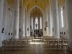 В XIV века на месте романского здания-предшественника, остатки которого являются часть современного здания, была построена готическая церковь — от неё сохранились стены фундамента и основание алтаря. Исследователи датируют их 1389—1390 годами. После 1475 года — после расширения хора и постройки нового нефа — церковь Святого Николая приобрела свой нынешний облик: главным архитектором был, вероятно, Стефан Пургхаузер (Бургхаузен) — сын Ганса фон Бургхаузена, принимавшего участие в постройке церкви Святого Мартина. Перестройка церкви Святого Николая была завершена в 1481 году. Позднеготический интерьер здания, как и позднейшие барочные и неоготические элементы, были в основном утрачены; хотя в здании до сих пор хранится деревянная скульптура Христа, изготовленная резчик Гансом Лайнбергером около 1523 года.