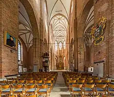 Строился храм в характерном для Северной Европы сдержанно-готическом стиле. Первоначально церковь представляла собой, по-видимому, небольшое помещение зального типа с тремя нефами одинаковой высоты и, вероятно, с отдельно стоявшей башней.[4] В наши дни остатки этого сооружения образуют центральную часть храма (внешние стены боковых приделов и несколько колонн в интерьере[5]). В 1408–1409 годах архитектор Иоганн Руммешоттель из Ростока построил новую алтарную часть здания (прообразом, возможно, послужила ростокская церковь Девы Марии[4]). Реконструкция храма была продолжена в 1456 году и длилась вплоть до 1473 года, когда завершилось строительство готической башни-колокольни. Часы на башне впервые появились в 1352 году.