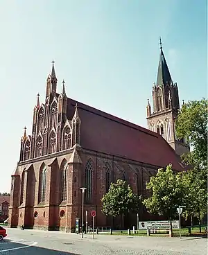 Уникальной архитектурной особенностью является восточный фронтон церкви. Формы Страсбургского собора перенесли в кирпич. В дальнейшем подобный элемент встречается в городских воротах Нойбранденбурга, в церкви Святой Марии в Пренцлау и кафедральном храме Святого Якуба в Щецине.