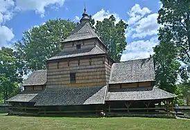Церковь относится к раннему галицкому типу. Высокий сруб квадратного нефа завершен пирамидальным палаточным верхом с одним залом. Церковь окружает крытая галерея, опирающаяся на столбы с подкосами.