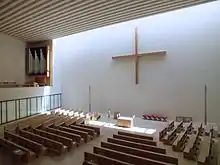 В 2009 году был объявлен международный конкурс, привлекший более двадцати архитектурных бюро и победу в котором одержали лейпцигские архитекторы Ансгар и Бенедикт Шульц (нем. Schulz und Schulz Architekten GmbH), предложившие функционально и в то же самое время сдержанно «вписать» здание церкви в необычный по форме участок, напоминающий сильно вытянутый треугольник. Решение состояло в том, чтобы разместить основной объём постройки в восточной части участка (собственно церковь с общинным центром), к которому примыкают частично лишённые первого этажа протяжённые боковые флигели, создающие своего рода открытый внутренний двор типа патио и восходящие к венчающей участок пятидесятиметровой башне-колокольне.[3]