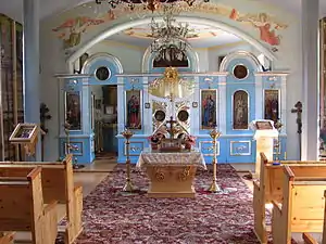 Первый иконостас был привезён из разобранной деревянной церкви из Холмщины и был установлен в 30-е годы XX столетия. В 1947 году во время выселения лемков этот иконостас не сохранился. С этого времени сохранились только царские врата. Сегодняшний иконостас собран из современных икон. Над хорами располагаются 12 овальных икон, привезенных из разобранной церкви, находившейся до 1947 года в деревне Свежова-Руска. В храме находится копия Почаевской иконы Божией Матери. В храме установлены скамейки.
