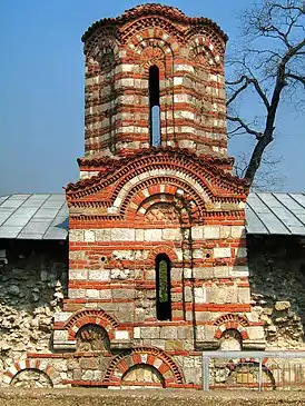 Здание представляет собой крестово-купольный храм[2], а её целла имеет почти квадратную форму (10 на 7 метров)[1][4]. Церковь обладает одной апсидой и одним нефом[1], а ранее у неё было три купола. Продолговатый главный восьмиугольный купол сохранился, а два других, располагавшихся над притвором, были соответственно разрушены вместе с ним. Стены церкви были сложены из прямоугольных каменных блоков, чередующихся с двумя рядами красной кирпичной кладки. Более сложные каменные и кирпичные узоры украшают фасад и главный купол. Каждая из восьми сторон купола имеет арки. В отделке фасада использовался мрамор[4]. Общий архитектурный стиль был уподоблен средневековым церквям Велико-Тырново и Несебыра[1].