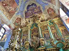 В интерьере также сохранились сравнительно поздние росписи: первоначально храм был расписан в конце XVIII – начале XIX вв., но затем во второй четверти XIX в. росписи поновлялись художником Я. Зотиным. Росписи выполнены в академическом стиле. Сюжетные композиции помещены в своеобразные богато декорированные рамы, которые в некоторых местах на стенах переходят в архитектурные кулисы. Сюжетную основу росписей храма составляет цикл Страстей Христовых, который разворачивается на стенах и достигает своей кульминации в росписях свода. Центральное место на западной стене занимает сцена «Моление о чаше», сбоку от которого помещены «Поцелуй Иуды» и «Христос перед Каиафой», а под ним – «Увенчание тернием». На южной стене расположены сцены «Отречение Петра» и «Предательство Иуды», а на северной – «Суд Пилата» и «Христос на суде у Ирода». Апогея цикл Страстей Христовых достигает в росписях свода: в северном лотке – «Несение креста», в восточном – «Распятие», в южном – «Снятие с креста» и в западном – «Положение во гроб». Интересно, что в сцене «Распятия» живописью является лишь изображение ангелов над крестом, в качестве распятия же используется распятие, венчающее иконостас. Между окнами на северной и южной стене четверика помещены изображения святых в полный рост. В конхе апсиды изображена Тайная вечеря.