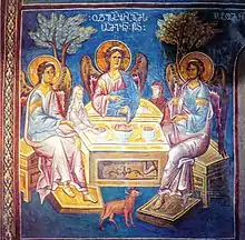 Сохранились следы настенной живописи X—XI века, но существующий цикл фресок датируется XIV веком. Они характеризуются аккуратно окрашенными, динамичными и выразительными изображениями несколько вытянутых человеческих фигур[4][5]. На верхнем ярусе центральной апсиды изображения сидящей на троне Богоматери с младенцем и двумя ангелами, композиция Евхаристии, сцена «Жёны-мироносицы у Гроба Господня», встреча жён-мироносиц с воскресшим Христом. На среднем ярусе апсиды изображение «Гостеприимства Авраама» с тремя ангелами, сюжет «Жертвоприношение Авраама», фигуры ангелов и святителей. На нижнем ярусе изображения святителей Василия Великого и Григория Богослова. На западной стене — часть композиции «Успение Пресвятой Богородицы» и сцена передачи Богородицей пояса апостолу Фоме. Снаружи над дверью южного придела — изображение Богородицы на троне с двумя ангелами за ней[6].