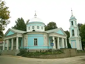 Храм односторонний, с куполом с декоративным фонарём, установленным на большом световом барабане. В храме три престола: главный престол освящён во имя Успения Пресвятой Богородицы, левый престол во имя Ксении Петербургской и правый престол во имя Патриарха Тихона. К югу от церкви расположена двухъярусная колокольня со шпилем. Украшение колокольни совпадает с декором церкви, но более разнообразно. Весь комплекс представляет собой образец тонкой «надписи» храма Нового времени на существующих постройках старого средневекового города[4].