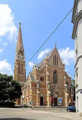 Неоготическая псевдобазилика архитектора Рихарда Йордана расположена на Клеменс-Хофбауэр-Плац (Clemens-Hofbauer-Platz) и обращена к площади южной стороной с колокольней. С севера к ней примыкают трехэтажный монастырь и монастырский сад. Церковь построена из голого кирпича, имеет множество приделов. Над входными порталами расположены барельефы из песчаника. На центральном — Божья Матерь Неустанной Помощи со Св. Альфонсо Марией де Лигуори, основателем ордена, и Св. Клеменсом Марией Хофбауэром, а также герб ордена редемптористов. На контрфорсах стоят статуи Св. Терезы Авильской, архангела Михаила, Св. Леопольда и Марии Магдалины. Барельефы на тимпанах и статуи — работа скульптора Рохуса Хаса, он же выполнил пьету в нише у основания колокольни.