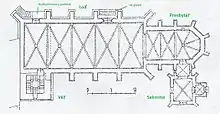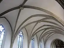 Важная составная часть внутреннего пространства — обширный крестообразный рёберный свод, имеющий почти полукруглую слегка стреловидную форму. Вес каменного грушевидного ребра распределяется на пятиугольные округлые консоли стен, сверху они соединены умеренно выступающими круглыми соединениями.