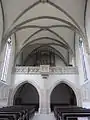 Псевдоготический каменный хор на западе сформирован двумя стреловидными профильными аркадами и центральной стойкой, кульминационное стропило лоджии украшено нечётным количеством кружков. Средняя стойка держит полустолб, несущий профильный эркер, который был первоначально разработан для трибун алтаря. Орган, расположенный на хоре относятся к концу XIX века.