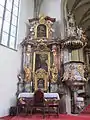 В южной стене пресбитерия есть оригинальное готическое святилище, в северной стене — святилище позднего Ренессанса с удивительной железной кованной дверью. На северной стене пресбитерия можно полюбоваться картинами «Двенадцатилетний Иисусом в храме» и «Христос и прелюбодейка», написанными австрийским художником Михаэлем Вацлавом Халбаксом.