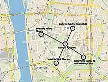 В некоторых источниках можно найти гипотезу о связи геометрического положения местности и христианской мистики с расположением важных зданий, построенных во времена Карла IV. Пять церквей Нового города, основанных Карлом, образуют правильный крест. Северо-южное плечо — соединение церквей святой Катерины и Благовещения Пресвятой Богородицы на Слупи, западно-восточное плечо — храмы Вознесения Девы Марии, Святого Карла Великого и Девы Марии на Слованех, плечи пересекаются в костёле святого Аполлинария. Башни церквей на Травничке (Благовещения Пресвятой Богородицы на Слупи), Аполлинария, Катерины стоят в одной линии и имеют одинаковые архитектурные характеристики, что порождает версию о запланированном расположение этих святилищ в начальной планировке Нового города, хотя фактические храмовые сооружения строились постепенно (Словены 1347, Карлов 1352, Екатерининская 1355, Травничек 1360, святой Аполлинарий 1362). Крест зданий в средние века означал особое благословение для города. Его вертикальный луч, продлённый к югу, заканчивается на Вышеграде около построенного на храмовой оси собора святых Петра и Павла.