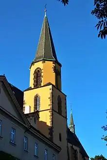 Вторая часть состоит из готического октагона, стены которого разделены четырьмя стреловидными окнами с каменными откосами. Башню венчает крутая пирамидальная крыша.