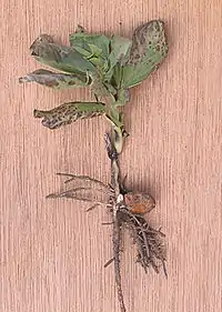 — сельдерея (возбудитель Cercospora apii): листья и черешки покрываются желтовато-бурыми пятнами; появляются вдавленные пятна на стеблях; растения отстают в развитии, желтеют и засыхают[5].