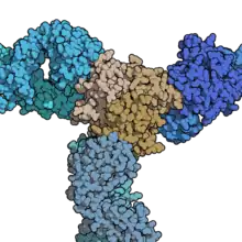 Три молекулы Цертолизумаба (оттенки синего), связанные с гомотримером фактора некроза опухоли (жёлтый).
