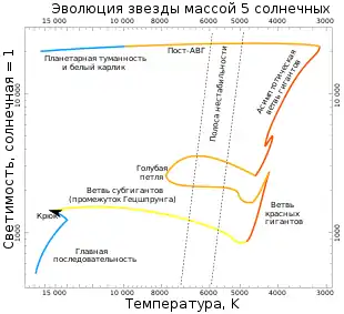 В ходе эволюции звёзды меняют свои параметры, равно как и положение на диаграмме Герцшпрунга — Рассела. Когда в недрах звёзд в результате синтеза заканчивается водород, они начинают увеличиваться в размерах и охлаждаться, сходя с главной последовательности и переходя на стадию субгигантов. В это время массивные звёзды могут перейти полосу нестабильности и на время стать цефеидами — на этой стадии такой переход занимает 102–104 лет, что очень мало по астрономическим меркам. После этого звезда переходит на ветвь красных гигантов, и, если её масса достаточно велика, то гелий в ней вступает в термоядерную реакцию постепенно, из-за чего звезда переходит на так называемую голубую петлю. В зависимости от массы, звезда на голубой петле может пересечь полосу нестабильности до двух раз и находиться на ней значительно дольше, чем при первом прохождении. В некоторых случаях звезда может дважды пройти голубую петлю, и, соответственно, переходов полосы нестабильности на этой стадии будет четыре[5][9][23].