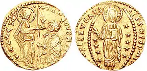 На аверсе монеты был изображён Христос, на реверсе — коленопреклонённый дож, принимающий из рук святого Марка знамя. Круговая легенда на аверсе гласила: SIT TIBI CHRISTE DATUS, QUEM TU REGIS ISTE DUCATUS («Это герцогство, коим ты правишь, тебе, Христос, посвящается»). От последнего слова легенды произошло обиходное название монеты — дукат.