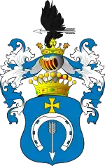 Щит увенчан дворянским коронованным шлемом. Нашлемник: чёрное крыло коршуна, горизонтально пронзенное серебряной стрелой влево. Намет: лазоревый с серебром.
