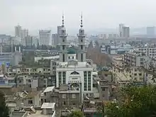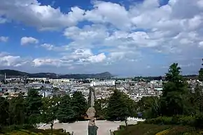 Эти места считаются родиной евнуха-мореплавателя Чжэн Хэ. В честь именитого земляка назван парк на горе Юэшань (Лунная гора), в котором установлены памятник Чжэн Хэ и мемориальная черепаха. Есть в парке и могила Ма Хаджи, отца Чжэн Хэ. (Могила самого Чжэн Хэ находится на горе Нюшань под Нанкином, а кроме того, нередко утверждается, что он умер во время своего последнего плавания, и был предан морскому погребению). В честь Чжэн Хэ названа и местная мечеть.
