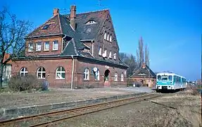 Triebwagen von Ziesar nach Güsen vor dem denkmalgeschützten Bahnhofsgebäude in den 1990er Jahren