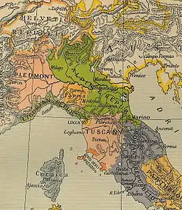 ![]() Цизальпинская республика (зелёным цветом) на карте Северной Италии в 1799 году |