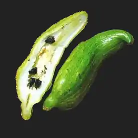 Плоды длиной 5—7 см и диаметром 2,5—3 см, вытянуто-овальные, суженные с обоих концов, верхушка часто бывает искривлена. Кожица зелёная, а в состоянии полной спелости — бледно-зелёная или кремовая. Стенки плода толщиной около 4 мм, сочные. В полой внутренней камере содержится 8—10 чёрных твёрдых семян.