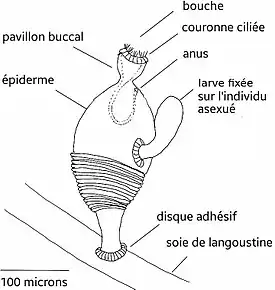 - Половая непитающаяся. Свободноплавающие самцы и самки длиной около 84 мкм и шириной 42 мкм. У самцов нет ни рта, ни ануса; у самок есть пищеварительная система, которая перерождается в личинку.