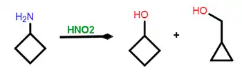 Через реакции перегруппировки Демьянов, то реакция на циклобутиламина и азотистой кислоты производит циклобутанол и другие побочные продукты.