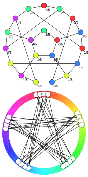 В таком случае цикловая раскраска, согласно второму определению выше, является гомоморфизмом в цикловой полный граф. Критическое обстоятельство об этих графах заключается в том, что допускает гомоморфизм в тогда и только тогда, когда . Это объясняет обозначение, поскольку если рациональные числа и равны, то и гомоморфно эквивалентны. Более того, порядок гомоморфизма уточняет порядок, задаваемый полными графами в плотный порядок и соответствует рациональным числам . Например
