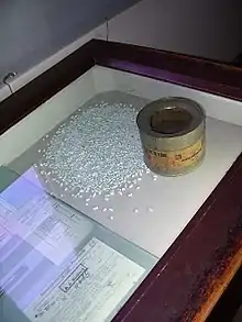 «Цикло́н Б» (нем. Zyklon B) — пестицид на основе цианида, известный прежде всего использованием для массового уничтожения людей в газовых камерах лагерей смерти[1][2], создан в Германии в 1920-х годах. Он состоит из синильной кислоты, а также из раздражителя для глаз и одного из нескольких адсорбентов, таких как кизельгур. Вещество до сих пор производится в Чехии, в городе Колине, под торговой маркой Uragan D2[3][4].
