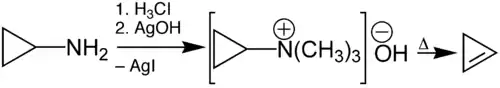 Циклопропиламин является исчерпывающим метилированным с йодистым метилом. Полученная таким образом йодистая соль реагирует с влажным гидроксидом серебра. Последующая сухая перегонка гидроксида циклопропилтриметиламмония дает циклопропен элиминированием Гофмана:
