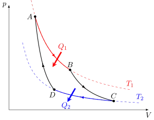 1. Изотермическое расширение (на рис. 1 — процесс A→B). В начале процесса рабочее тело имеет температуру , то есть температуру нагревателя. При расширении рабочего тела его температура не падает за счет передачи от нагревателя количества теплоты , то есть расширение происходит изотермически (при постоянной температуре) . При этом объём рабочего тела увеличивается, оно совершает механическую работу, а его энтропия возрастает.