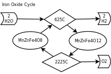 Цикл оксида железа (Fe3O4/FeO) — двухступенчатый термохимический цикл, используемый для производства водорода . [1] Он основан на восстановлении и последующем окислении ионов железа, а именно на восстановлении и окислении между Fe3+ и Fe2+. Ферриты, или оксид железа, участвуют в цикле в форме шпинели, и в зависимости от условий реакции легирующие металлы и материал носителя образуют либо вюститы, либо различные шпинели.