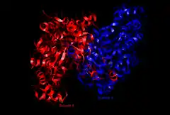 Цитратсинтаза была закристаллизована, и был проведён её рентгеноструктурный анализ в присутствии и отсутствии её субстрата и ингибиторов. Каждая субъединица этого гомодимерного фермента представляет собой единый полипептид с двумя доменами, один из которых — крупный и жёсткий, а другой — менее крупный и более пластичный; между этими доменами располагается активный центр фермента. Оксалоацетат — первый из субстратов, связывающихся с цитратсинтазой, — индуцирует значительные конформационные изменения в пластичном домене, создавая сайт связывания для молекулы второго субстрата — ацетил-КоА (см. справа). Когда в активном центре фермента образуется цитроил-КоА, в ферменте происходит второе конформационное изменение, обусловленное гидролизом тиоэфира с высвобождением КоА. Эти изменения конформации, вызванные сначала связыванием с субстратом, потом — промежуточным продуктом, препятствуют преждевременному и непродуктивному разрыву тиоэфирной связи в ацетил-КоА. Кинетические исследования цитратсинтазы подтверждают описанный выше двусубстратный механизм её работы. Вышеописанная цитратсинтазная реакция представляет собой альдольную конденсацию[8][9] (впрочем, некоторые авторы рассматривают её как конденсацию Клайзена[7]). Ниже представлен механизм цитратсинтазной реакции:
