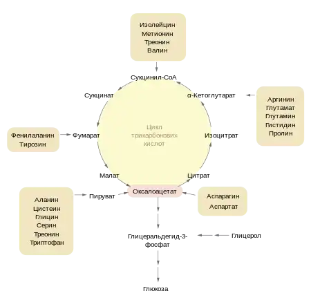 Из α-кетоглутарата, образующегося в цикле трикарбоновых кислот, синтезируются аминокислоты глутамин, глутамат, пролин и аргинин. Сукцинил-КоА выступает в качестве предшественника при синтезе порфиринов и гема. Цитрат участвует в синтезе жирных кислот и стеролов (из цитрата образуется ацетил-КоА, кроме того, он выступает в роли регулятора[26]). Малат может транспортироваться из митохондрий в цитоплазму, где он обратимо превращается в оксалоацетат. Получившийся оксалоацетат может служить предшественником для синтеза аминокислот аспартата, аспарагина, метионина, треонина и изолейцина, а также пиримидинов. Он может также превратиться в фосфоенолпируват с затратой ГТФ, а фосфоенолпируват (ФЕП) может служить предшественником в биосинтезе фенилаланина, тирозина, триптофана, серина, глицина и цистеина. Пируват, получающийся из ФЕП в процессе гликолиза, может стать предшественником аланина, лейцина и валина, а также может участвовать в глюконеогенезе[24][25].
