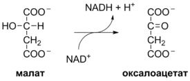 В последней реакции цикла трикарбоновых кислот НАД-зависимый фермент L-малатдегидрогеназа катализирует окисление L-малата до оксалоацетата[17] (реакция 10 на общей схеме):