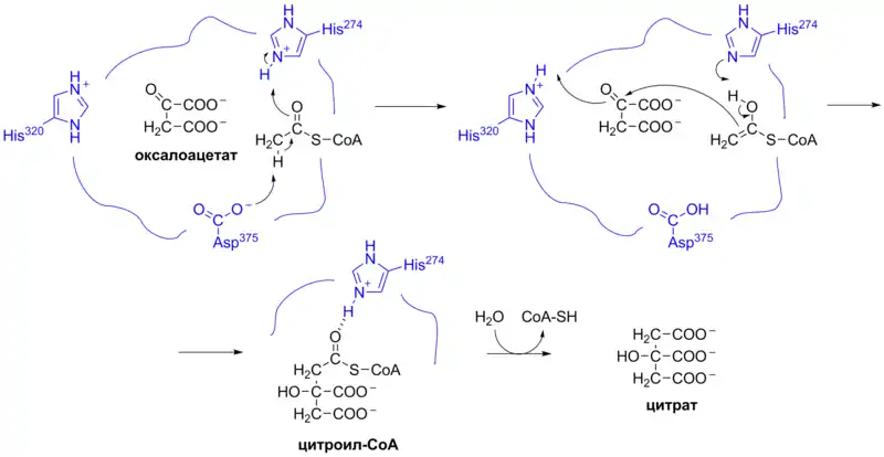 - Тиоэфирная связь в ацетил-КоА активирует атомы водорода в метильной группе. Остаток аспартата в активном центре цитратсинтазы отщепляет протон от метильной группы, образуя промежуточное енольное соединение. Это соединение стабилизируется водородной связью и/или протонированием остатком гистидина His274 в активном центре фермента.