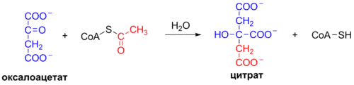 В этой реакции метильная группа в составе ацетильной группы ацетил-КоА присоединяется к карбонильной группе (второму атому углерода, C2-атом) оксалоацетата. В ходе этой реакции в активном центре фермента образуется промежуточное соединение — цитроил-КоА. Оно быстро подвергается гидролизу и расщепляется на свободный КоА и цитрат, которые удаляются из активного центра фермента. Гидролиз этого высокоэнергетичного тиоэфирного промежуточного соединения делает эту реакцию весьма экзергонической. Большое отрицательное изменение стандартной свободной энергии цитратсинтазной реакции необходимо для управления циклом, поскольку, как отмечалось ранее, в норме концентрация оксалоацетата в клетке очень мала. КоА, высвобождаемый при этой реакции, далее участвует в окислительном декарбоксилировании следующей молекулы пирувата при помощи пируватдегидрогеназного комплекса[7].